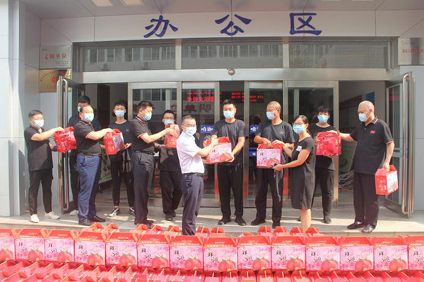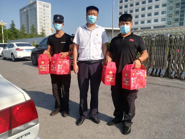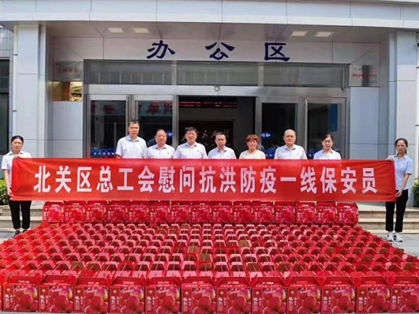 8月9日、10日北關(guān)區(qū)總工會副主席薛梅、保障部部長司尚雯來到安陽市洹河保安服務(wù)有限責任公司,送來抗洪防疫慰問品鮮桃500多箱,向堅守崗位、奮戰(zhàn)一線的保安隊員進行慰問,提醒大家做好防控工作的同時一定要做好自身防護。