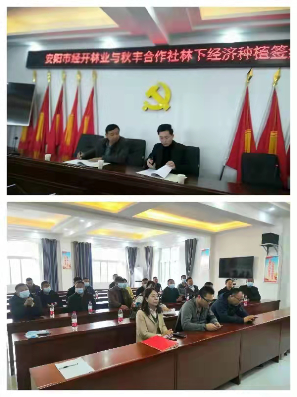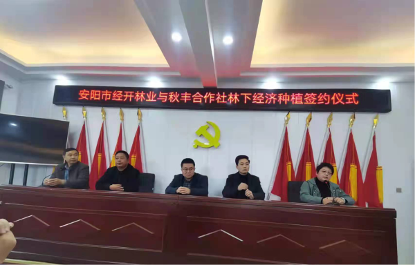 2022年3月9日,經(jīng)開林業(yè)公司與曲溝鎮(zhèn)秋豐合作社在曲溝鎮(zhèn)東彰武村舉行安陽(yáng)市國(guó)儲(chǔ)林項(xiàng)目林下經(jīng)濟(jì)合作開發(fā)簽約儀式,本次簽約儀式由曲溝鎮(zhèn)副鎮(zhèn)長(zhǎng)王安玉主持,殷都區(qū)林業(yè)局、經(jīng)開林業(yè)公司及秋豐合作社相關(guān)人員出席簽約儀式。